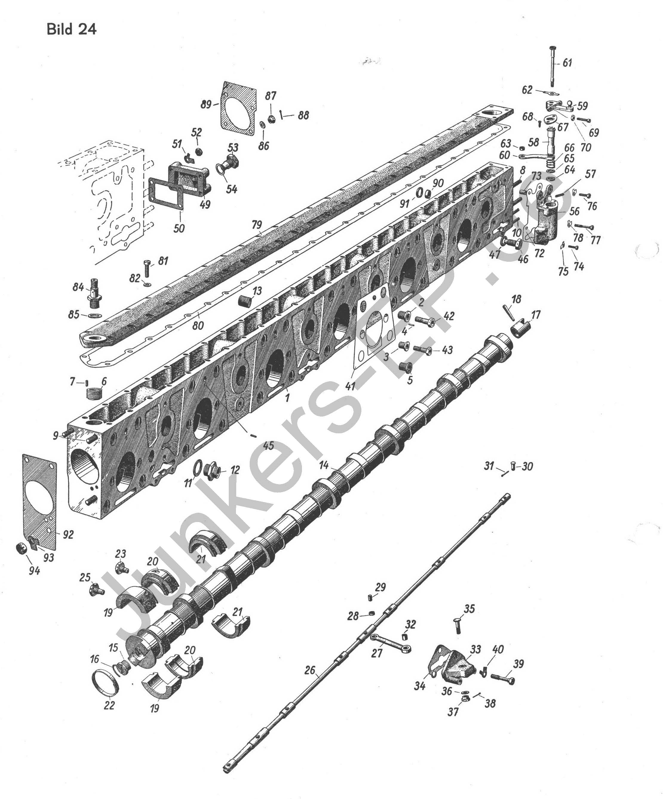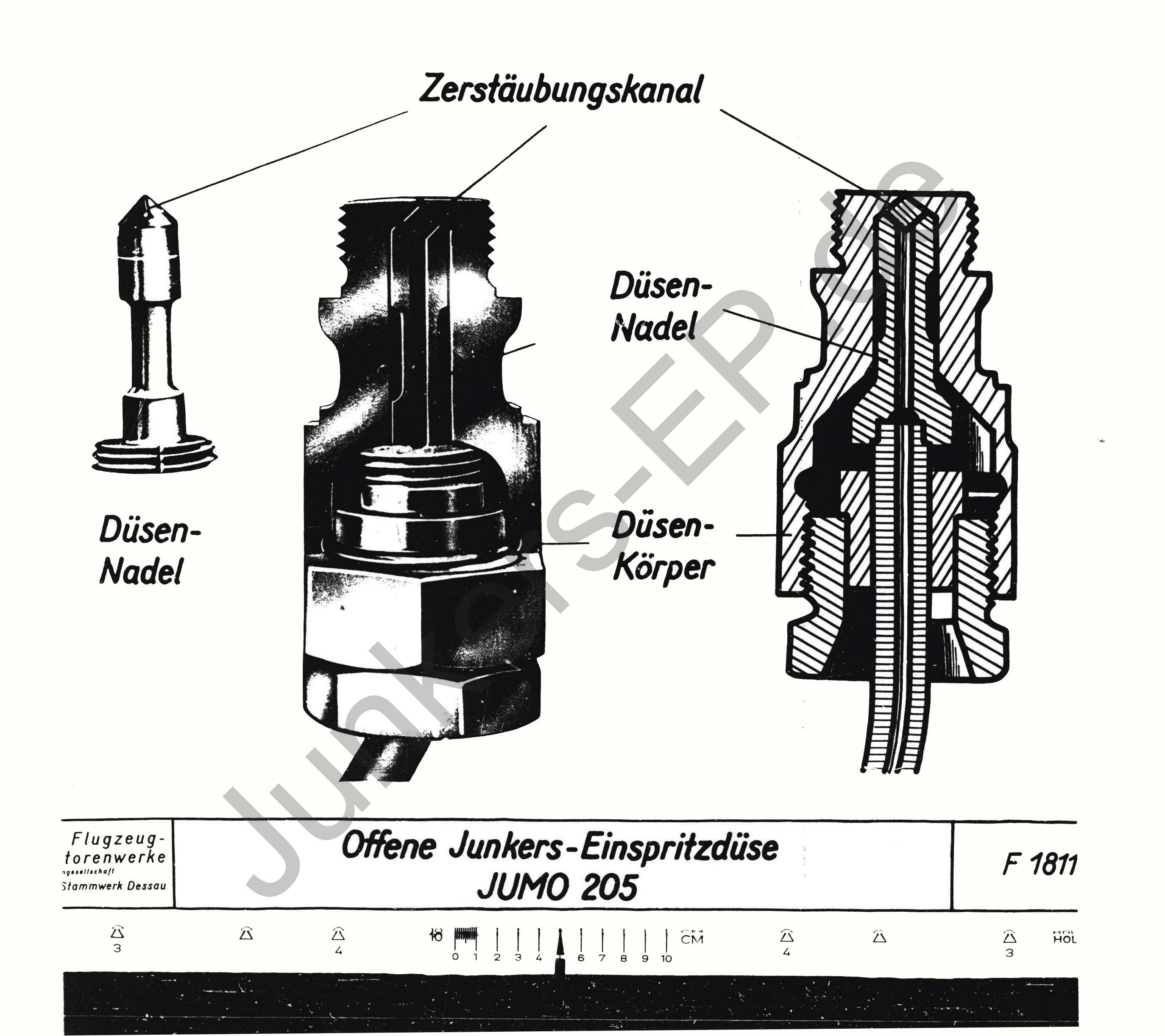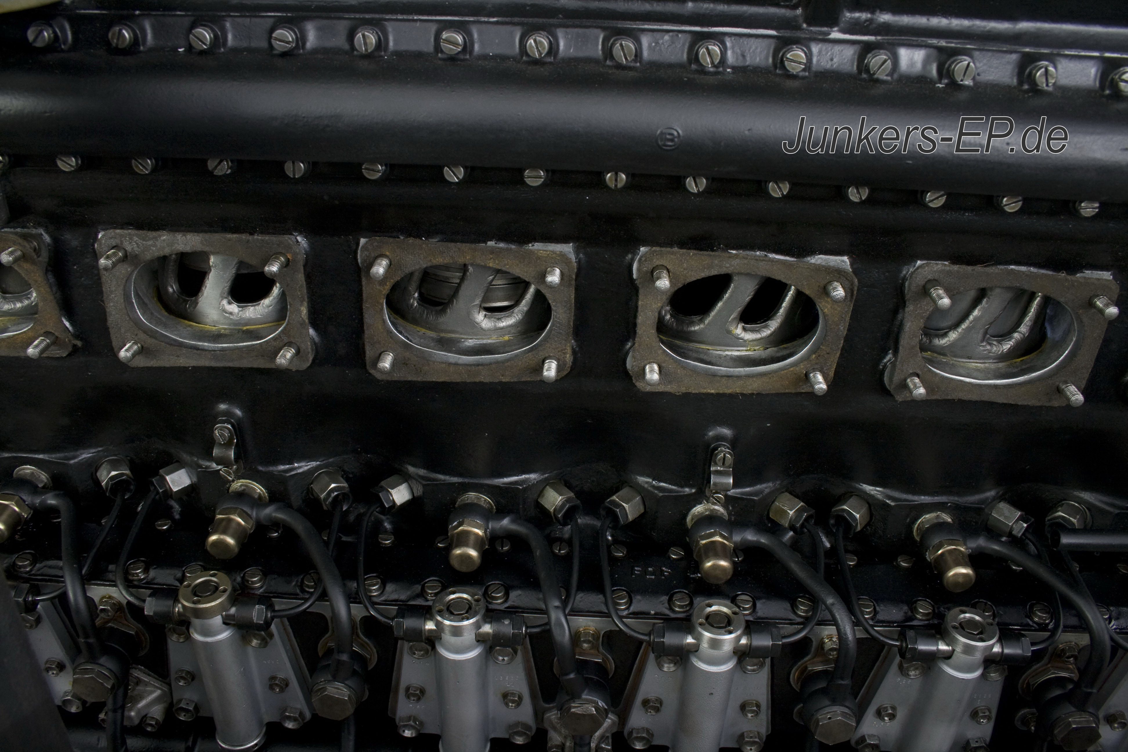 Nicht nur die Form ist außergewöhnlich, sondern auch das Prinzip das dahinter steckt. Zwei Kurbelwellen, die an der Vorderseite mit Zahnräder verbunden sind und somit den Gleichlauf beider Kurbelwellen garantieren. In einer Laufbüchse sind 2 Kolben, die aufeinander zulaufen (Gegenkolben-Prinzip). In der Mitte der Laufbüchse sind 5 Öffnungen, 4x für die Einspritzdüsen und eine Düse für Pressluft für den Startvorgang. Später wurde nicht mehr per Pressluft gestartet oder nur im Notfall und wurde durch einen Schrungkraftanlasser ergänzt oder ersetzt. Ab dem Jumo 205 D wurde nur noch über den Schwungkraftanlasser gestartet. Pro Laufbüchse gabe es 2 Einspritzpumpenlelemente, die 4 Einspritzdüsen mit Treibstoff versorgten. Die weiteren Erklärungen beziehen sich auf den Jumo 205 C4. In unserer heutigen Zeit sind wir es gewohnt, dass die Einspritzpumpe ein kompacktes Bauteil ist. Beim Jumo 205 hingegen haben wir 2 Bänke mit jeweils 6 Einspritzpumpenelemente, auf jeder Seite eine. Jede Bank hatte eine Nockenwelle und trieb somit 6 Einspritzpumpenelemente an. Ein weiteres besonderes Merkmal war das Gebläse (heute würden wir dazu mechanischer Lader nennen) und der Jumo besaß keine Ventile. Gesteuert wurden die Ein- und Auslaß über die Kolben, dazu waren die Kurbelwellen nicht ganz synchron miteinander. Die Kurbelwellen sind so eingestellt, dass der Auspuffkolben (oben) dem Spülkolben (unten) um 9° voraus eilt. Dadurch öffnet sich beim Arbeitstakt die Auspuffseite zuerst, um ein zurückschlagen der Auspuffgase in den Ansaugkanal zu verhindern. Jetzt kann das Spülgebläse den Zylinderraum durchspülen, derher der Name Spülgebläse. Beim Ansaugen der Luft wird zuerst die Auspuffseite geschlossen und mit dem Spülgebläse wird noch Luft in den Brennraum gepreßt. Die Einspritzung erfolgte 16° vor Volumentotpunkt (geringster Abstand zwischen den Kolben).